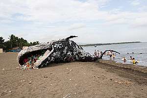 Philippines, 11 mai 2017, baleine en plastique échouée: cette réplique de baleine sur la plage de Naic à Cavite, au sud de Manille, vise à illustrer la cause de la mort de nombreuses baleines: les déchets plastiques.