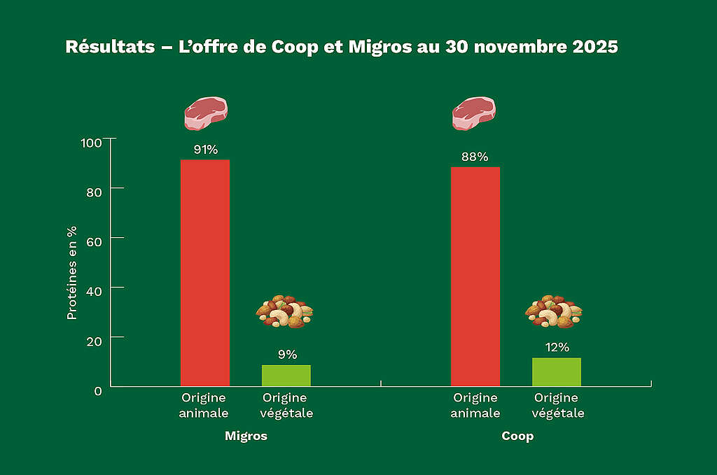 Greenpeace Suisse publie ce jour une analyse de la répartition des protéines chez Coop et Migros. 90% des protéines proposées sont d’origine animale, contre 10% d’origine végétale. Résultats identiques pour les promotions : 90% concernent la viande, le poisson, les œufs et les produits laitiers. Pour réduire les émissions de gaz à effet de serre, protéger la santé et augmenter l’autosuffisance alimentaire, Greenpeace Suisse demande au commerce de détail de vendre au moins 60% de protéines végétales d’ici 2035.