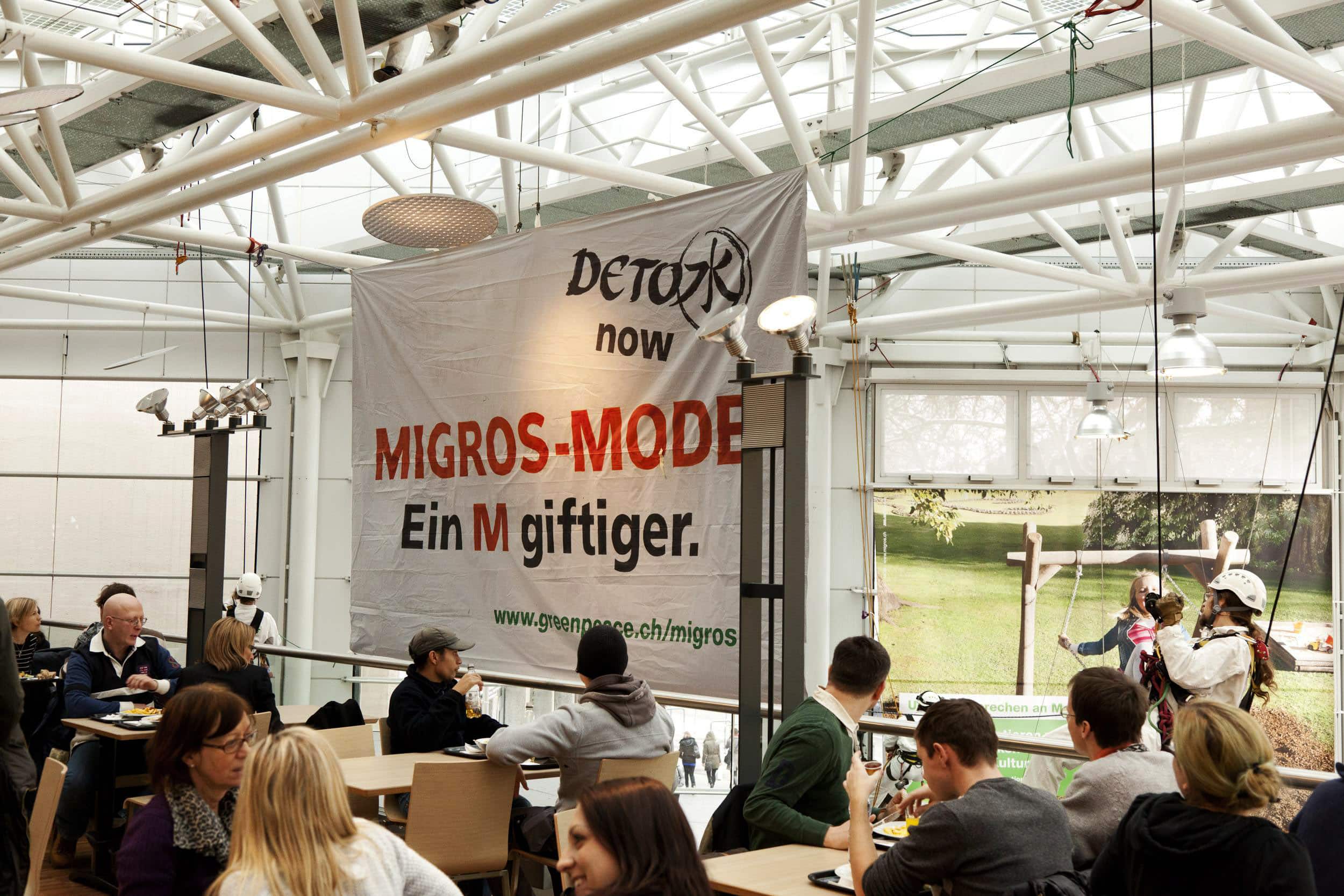 « Migros – un M toxique » indique la bannière, avec laquelle les militants sont montés sur le toit de l’entreprise à la Limmatplatz. Ils demandent aux grossistes d’éliminer d’ici à 2020 les produits chimiques dangereux de la chaîne de production de leurs vêtements – comme va le faire la Coop.