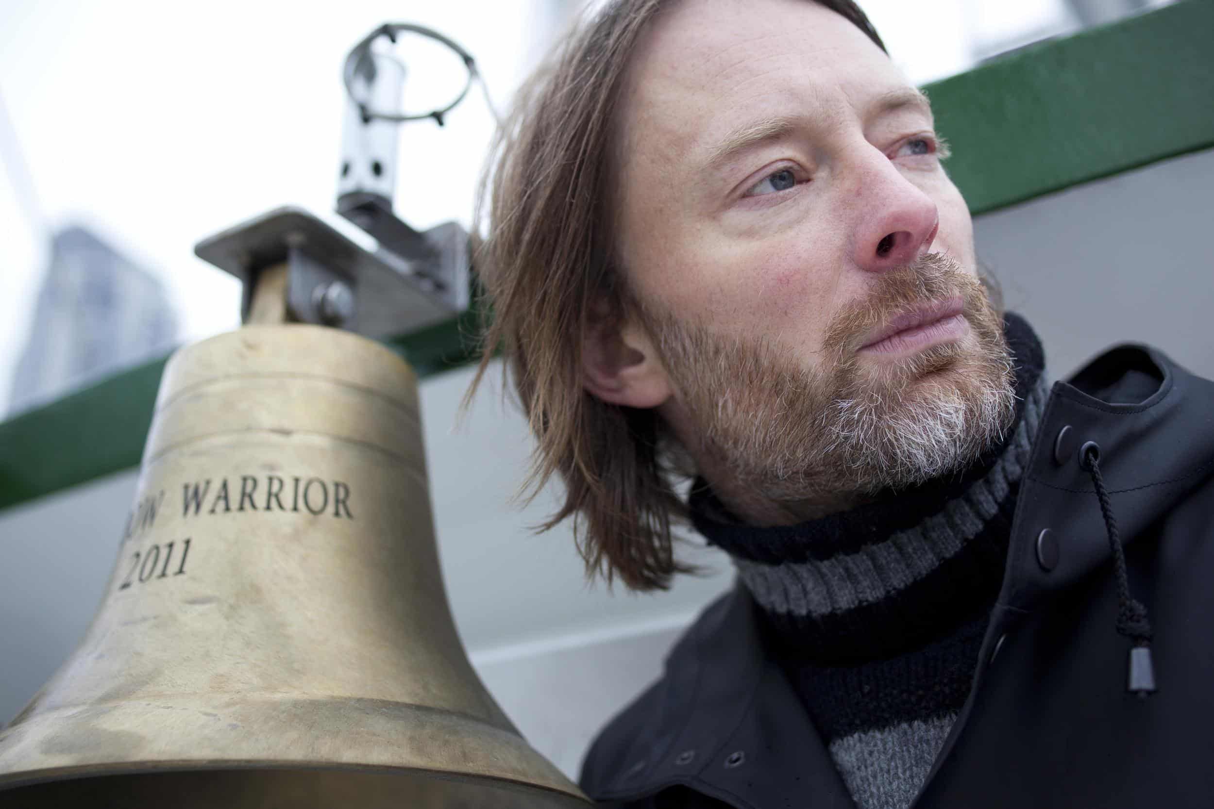 Thom Yorke, chanteur et principal compositeur du groupe de rock Radiohead sur le Rainbow Warrior lors de son voyage à Londres.