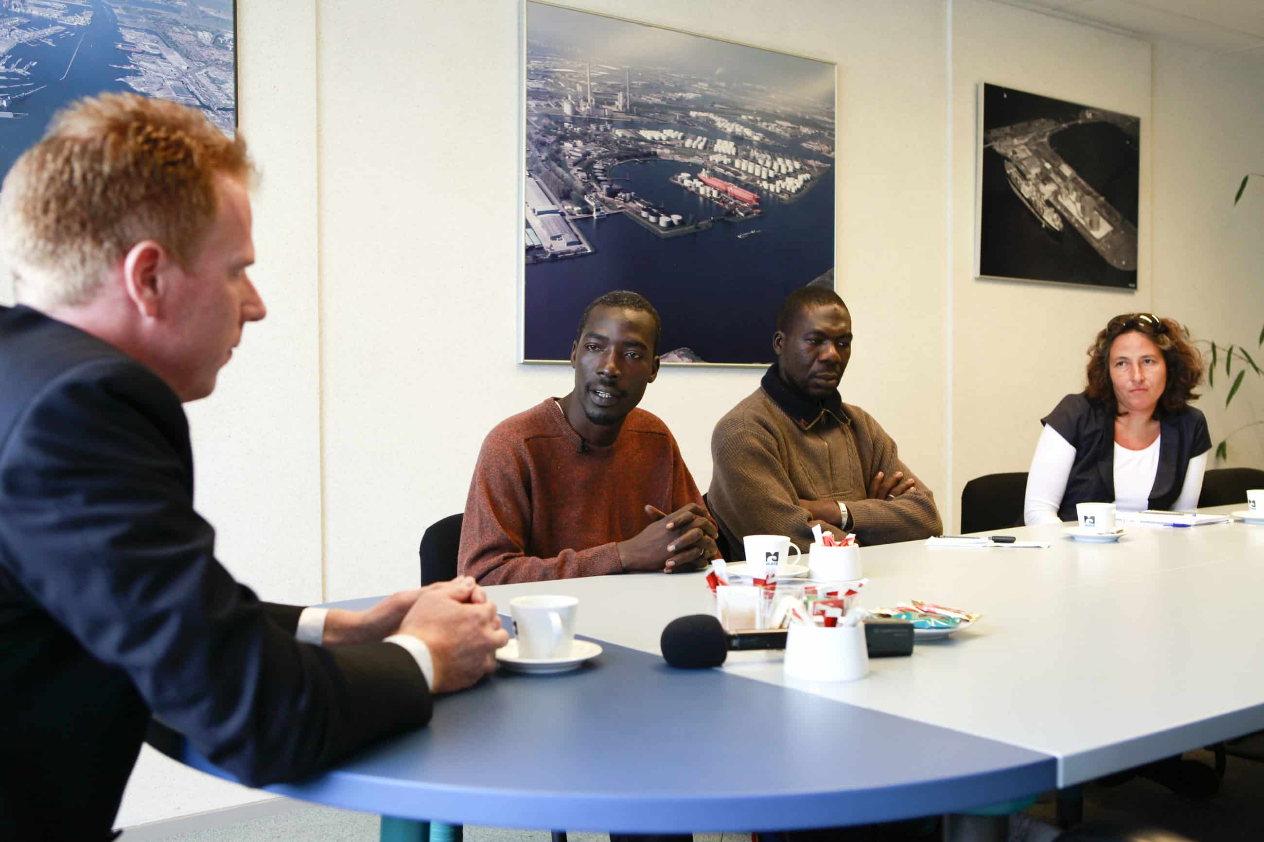 De gauche à droite: Robert Kruijff, directeur éxécutif de la société Main (anciennement APS), les chauffeurs poids-lourd, Amado Bakayoko et Doumbia Siaka, l’interprète et militante Greenpeace, Marietta Harjono. Amado Bakayoko et Doumbia Siaka ont été recrutés en 2006 par la société Trafigura pour éliminer les déchets toxiques du « Probo Koala » dans la capitale ivoirienne d’Abidjan. Ils se sont déjà rendus à deux reprises à Amsterdam (Pays-Bas) au siège de Trafigura dans l’espoir d’obtenir des excuses de la compagnie, en vain, pour leur avoir cacher la nature toxique de la cargaison dont il devait se débarrasser. A chaque fois la direction de Trafigura n’a pas souhaité les recevoir. Pour obtenir certaines réponses, ils se sont rendus à l’usine de traitement des déchets « Main » à Amsterdam, qui à l’origine devait traiter ces déchets toxiques, mais n’avait pas obtenu l’autorisation de le faire.
