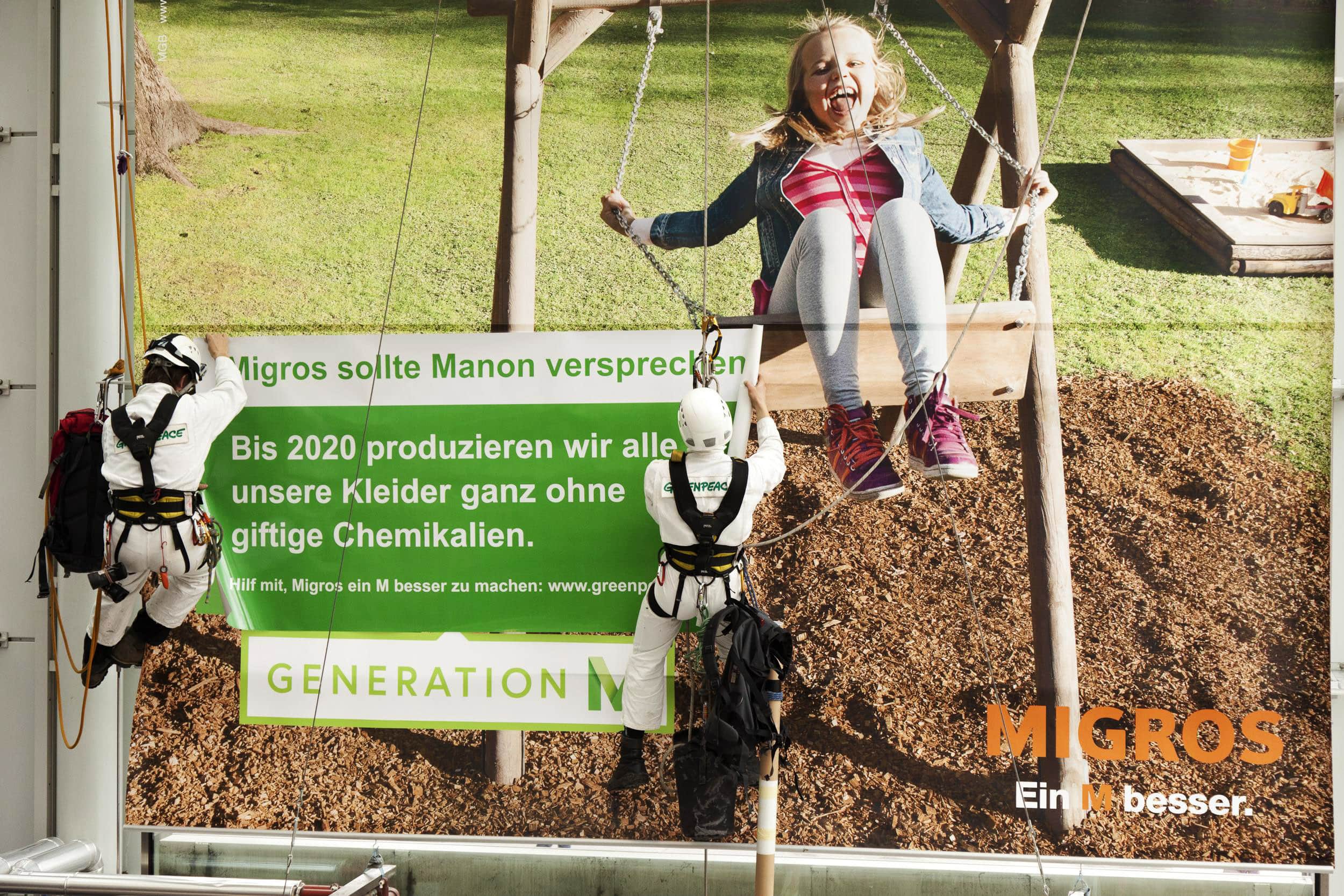 Des militants Greenpeace ont démarré une action contre le siège de Migros à Zurich afin qu’ils décontaminent à leur tour leur production de vêtements. De nouveaux tests ont montré une…