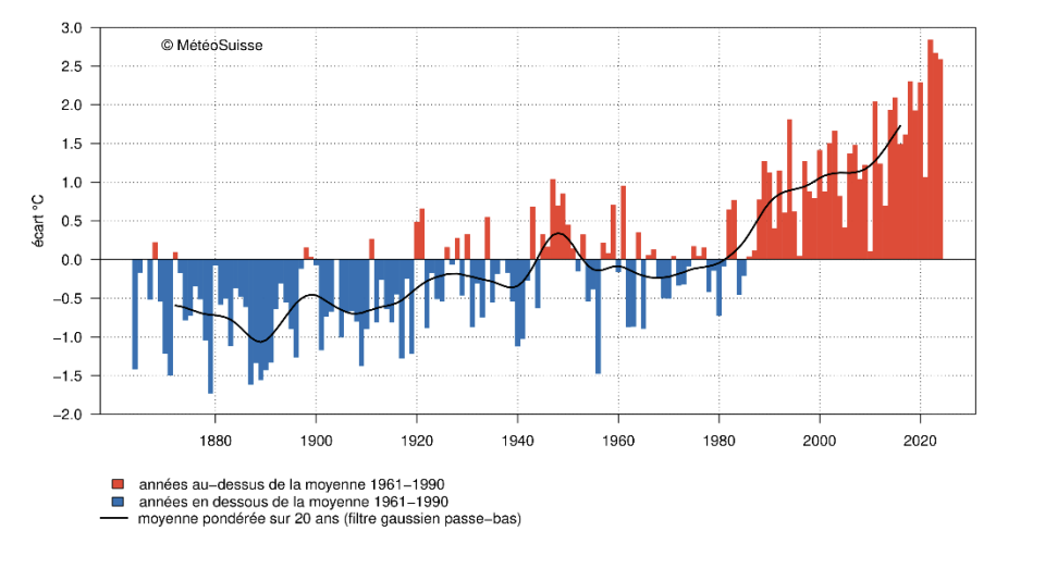 L’année 2024 a marqué un nouveau record: pour la première fois, nous avons dépassé 1,5 degré Celsius de réchauffement global, l’objectif supérieur fixé par l’Accord de Paris sur le climat. En Suisse, l’élévation du niveau de la température moyenne atteint même 2,8 degrés. Notre pays continue de se réchauffer. La Suisse devient plus sèche, plus chaude et moins enneigée. Elle est aussi confrontée à de plus fortes précipitations