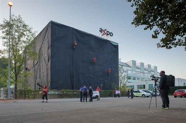 Jeudi 8 septembre 2016, à l’aube, une trentaine de militants Greenpeace ont recouvert de tissu noir le bâtiment de verre du siège de l’entreprise Axpo à Baden en Argovie. Cette…