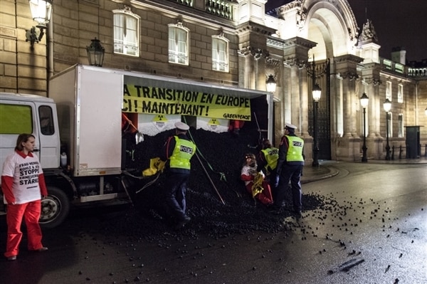 Ce matin à 6h30, quelques heures avant un Conseil des ministres franco-allemands, dix militants de Greenpeace ont déversé, à l’aide d’un camion, cinq tonnes de charbon devant le palais de…