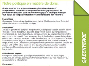 Greenpeace Suisse est une fondation selon l’article 80 et les suivants du Code civil suisse; elle est reconnue d’utilité publique. Afin de se garantir une complète indépendance, Greenpeace Suisse n’accepte…