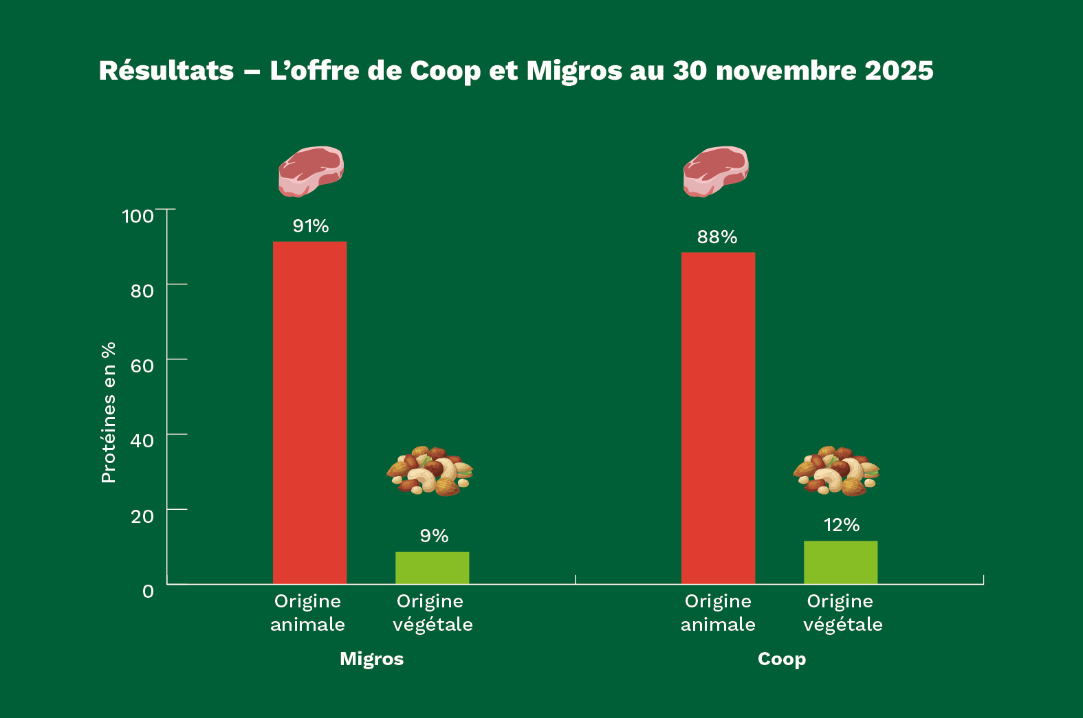 Nous avons publié une analyse sur la répartition des protéines chez Coop et Migros. 90% des protéines proposées sont d’origine animale, contre 10% d’origine végétale. Résultats identiques pour les promotions: 90% concernent la viande, le poisson, les œufs et les produits laitiers.