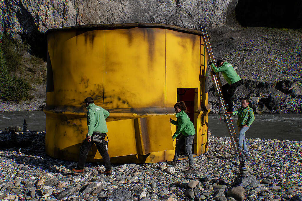 Il fait encore nuit dans les gorges du Rhin, dans le canton des Grisons. Les éléments en bois à transporter sont lourds et encombrants. Le chemin qui descend vers le Rhin antérieur est accidenté, et la situation est encore plus difficile sur la rive, où les nombreuses pierres sont autant de pièges sur lesquels on peut trébucher. Malgré des températures inférieures à dix degrés, les cinq militant·es Greenpeace sont rapidement en sueur. Ils transportent les éléments les uns après les autres jusqu’au banc de sable situé en contrebas de la gare de Versam-Safien.