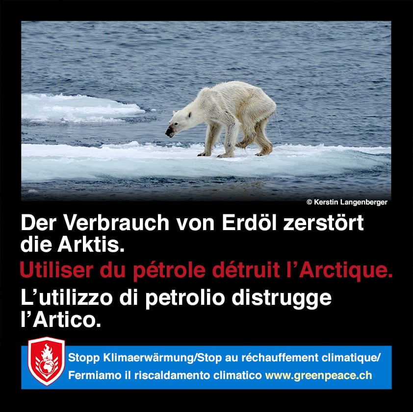 En 2007, Greenpeace Suisse avait déjà déposé une plainte similaire contre l’Union Pétrolière. La protection du climat est à nouveau abusivement utilisée comme argument publicitaire, et les lobbies pétroliers et gaziers ne semblent par tenir compte des décisions de la Commission Suisse pour la Loyauté. Greenpeace exige donc que les autorités politiques du pays imposent des messages d’avertissement obligatoires en matière de protection du climat, comme c’est le cas dans le cadre de la prévention des risques liés au tabagisme.