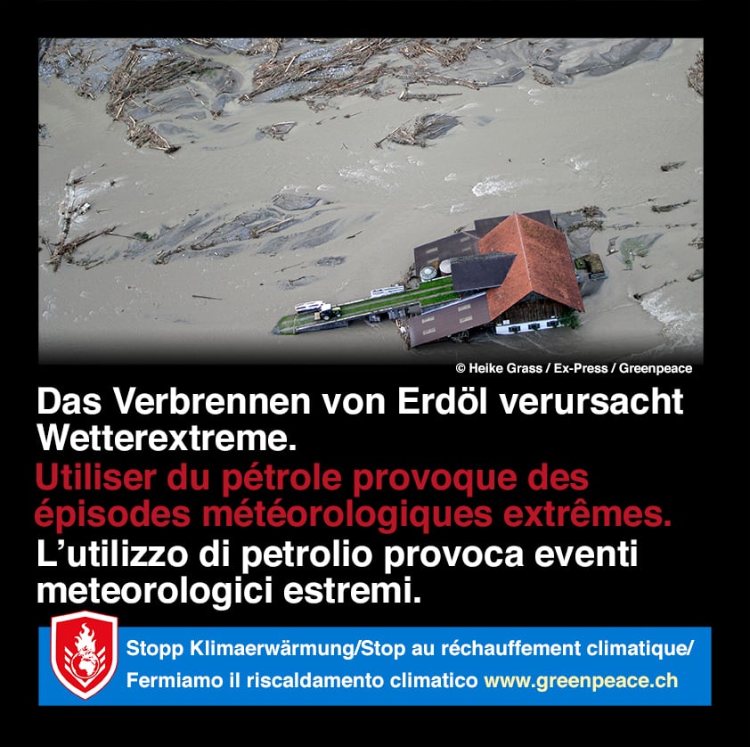 Chauffer au Mazout et au gaz ménagerait le porte-monnaie et contribuerait à la protection du climat. Pour Greenpeace Suisse il s’agit là de fausses affirmations, utilisées par l’Union Pétrolière et l’Association Suisse de l’Industrie Gazière (ASIG) afin de distordre la concurrence avec les énergies renouvelables. Ce matin, Greenpeace a déposé deux plaintes auprès de la Commission Suisse pour la Loyauté afin de faire cesser cette publicité trompeuse. Parallèlement, il est demandé aux autorités politiques d’imposer des messages d’avertissement sur les produits fonctionnant avec du gaz ou du pétrole, afin d’informer les consommateurs sur leurs conséquences néfastes pour le climat.