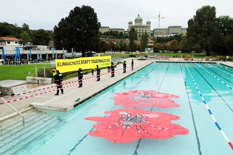 La protection du climat doit rapidement devenir la priorité de la politique suisse. C’est le message que des militants Greenpeace ont souhaité exprimer aujourd’hui à Berne, dans la piscine de Marzilibad. Il s’agit d’envoyer un signal clair au monde politique dénonçant la dépendance du pays aux énergies fossiles. C’est la première intervention de la Police du climat, dont le but est de protéger la population, de détecter les signes du réchauffement climatique, comme la multiplication du moustique tigre dans notre pays, et de rassembler des preuves contre les criminels climatiques.