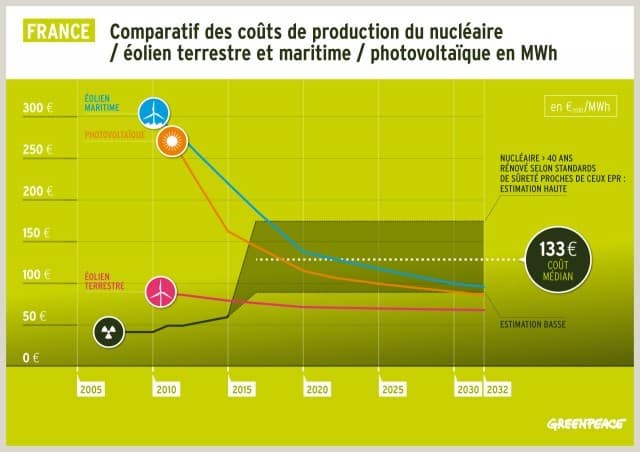 Les conclusions de l’analyse menée par Greenpeace sont claires: pour que le nucléaire reste moins cher que les énergies renouvelables à court terme, il faudrait le prolonger en bradant la sûreté, pourtant mise en exergue par les industriels et les États depuis le déclenchement de la catastrophe nucléaire de Fukushima.