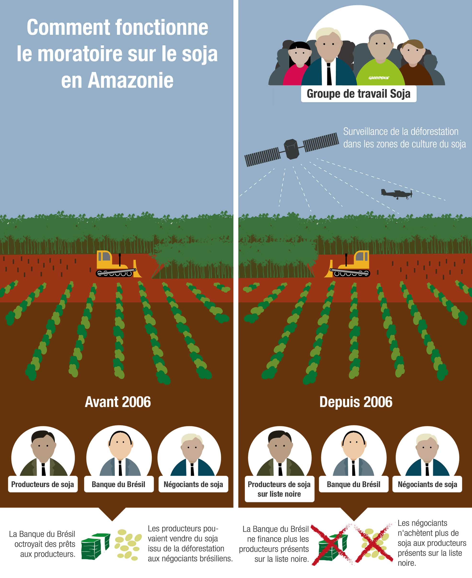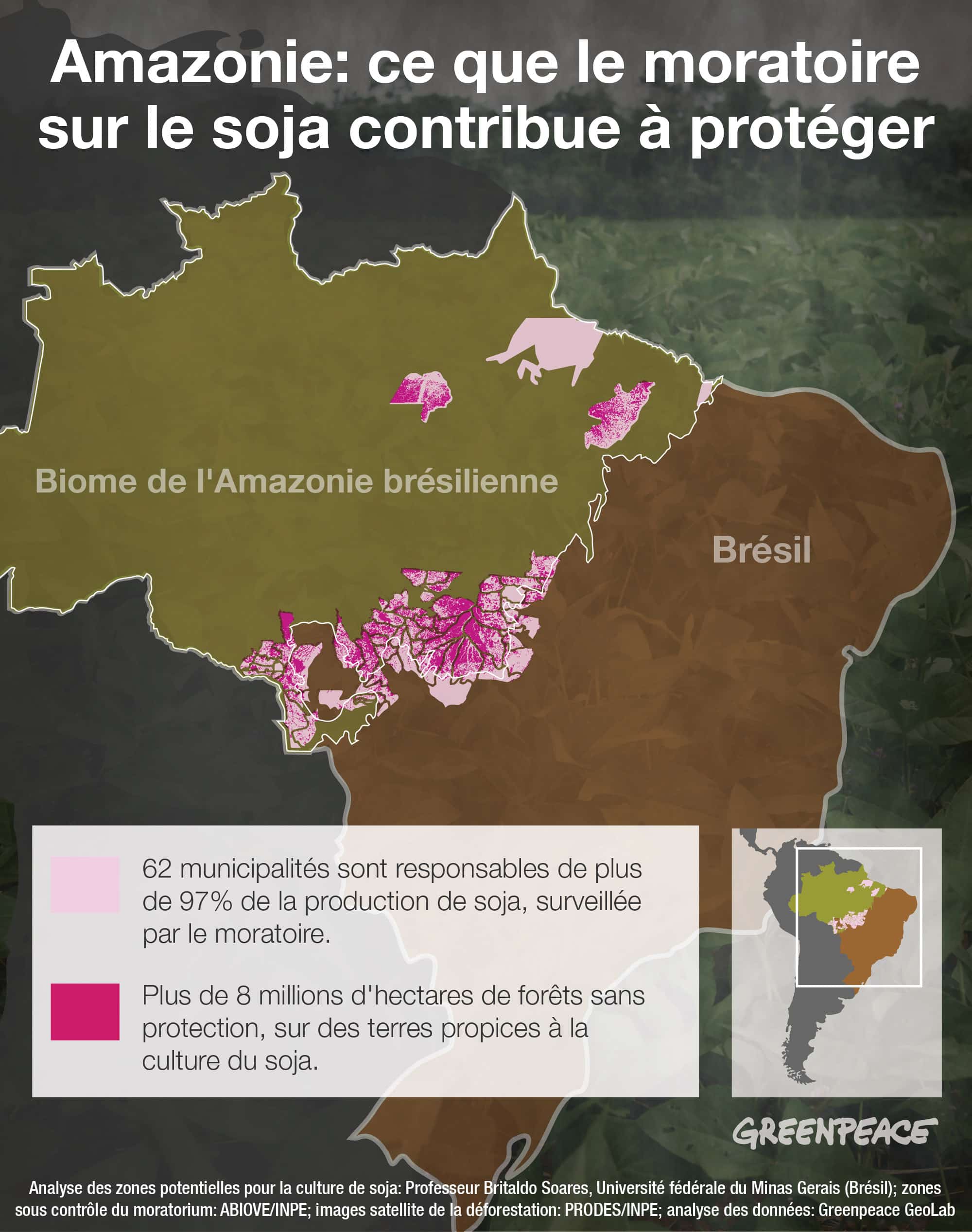 De grandes entreprises de l’industrie alimentaire soutiennent le moratoire depuis 2006 et ont réclamé aux commerçants de soja brésiliens une prolongation du moratoire. Cette dernière intervient à un moment crucial pour la forêt tropicale. En 2013, et pour la première fois depuis des années, la destruction de l’Amazonie a augmenté de 28%! Ce pourcentage a même atteint 52% au Mato Grosso et 37% au Para.