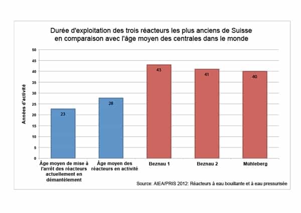 C’est avec inquiétude que Greenpeace accueille la motion présentée aujourd’hui par la Commission de l’environnement, de l’aménagement du territoire et de l’énergie du Conseil national (CEATE-N) qui instaure une limitation de la durée d’exploitation des centrales nucléaire suisse à 50 années d’activité. S’il est vrai que cette proposition instaure enfin une limite d’exploitation contraignante pour les réacteurs de notre pays, elle permet toutefois de prolonger l’expérimentation que constitue le maintien de la production d’électricité des réacteurs les plus vieux de la planète. Greenpeace lance aujourd’hui une pétition adressée au Conseil fédéral et au Parlement afin d’exiger une limitation à 40 ans. En proposant une durée d’exploitation de 50 ans, la CEATE-N fait de la Suisse un cobaye pour des expérimentations en matière de risques nucléaires. La moyenne de la durée d’exploitation des centrales nucléaires mises à l’arrêt jusqu’ici de par le monde est de 23 ans (voir les graphiques ci-dessous). Au regard de l’âge des réacteurs de Beznau 1 (43 ans) et de Mühleberg (40 ans) cette proposition est extrêmement préoccupante, car le risque d’un accident nucléaire majeur augmente avec chaque année d’activité.  La motion de la CEATE-N place les intérêts des exploitants des centrales nucléaires avant la sécurité de la population, ce qui est intolérable. ll est fort probable que les entreprises en charge de l’exploitation des centrales décident de presser le citron jusqu’au bout et fassent tout pour maintenir l’activité de leurs installations le plus longtemps possible.Greenpeace demande au Conseil fédéral et au Parlement de corriger la motion de la CEATE-N et de concrétiser la sortie du nucléaire en limitant à 40 ans la durée d’exploitation des centrales nucléaires. L’organisation lance aujourd’hui une pétition adressée aux Chambres et au Conseil fédéral, exigeant que l’activité des 5 centrales de notre pays cesse après 40 ans.