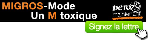 La Migros se donne l’image d’une entreprise qui s’engage pour l’environnement et les générations futures. Avec « Génération M », la Migros a fait des promesses pour l’avenir mais a refusé de décontaminer de manière crédible sa production de textiles. Greenpeace exige donc de la Migros qu’elle assume ses responsabilités et qu’elle prenne rapidement des mesures pour renoncer aux plastifiants, aux PFC et aux éthoxylates de nonylphénol.