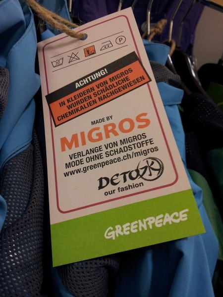 Des militants Greenpeace ont démarré une action contre le siège de Migros à Zurich afin qu’ils décontaminent à leur tour leur production de vêtements. De nouveaux tests ont montré une très haute concentration de substances polluantes dans une veste de pluie pour enfants. Contrairement à la Migros, Coop a déjà signé pour un avenir sans toxiques.