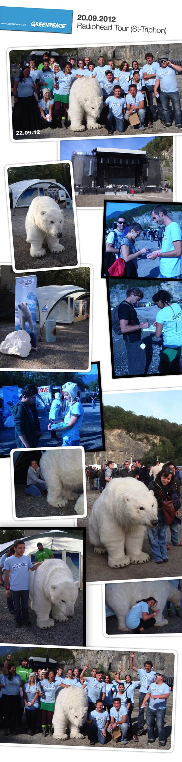 Les fans de Radiohead seront accueillis par un ours polaire grandeur nature et par des bénévoles de Greenpeace les enjoignant à soutenir la campagne pour la protection de l’Arctique, comme l’ont déjà fait plus d’1.8 millions de personnes de par le monde. C’est le résultat d’un partenariat entre le groupe et l’organisation de défense de l’environnement.
