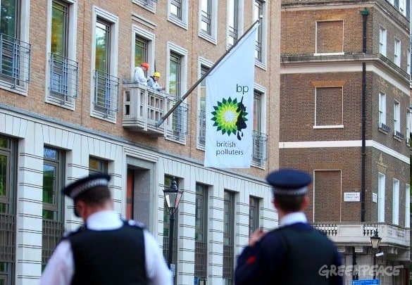 Jeudi 20 mai au matin, des militants de Greenpeace ont escaladé la façade du siège de la compagnie British Petroleum (BP), à Londres. Sur le balcon du bâtiment, les activistes ont accroché un drapeau aux couleurs du logo de BP « revu et corrigé »: le tournesol est entaché de pétrole, et les lettres BP ne signifient plus « pétrole britannique » mais « pollueur britannique ».