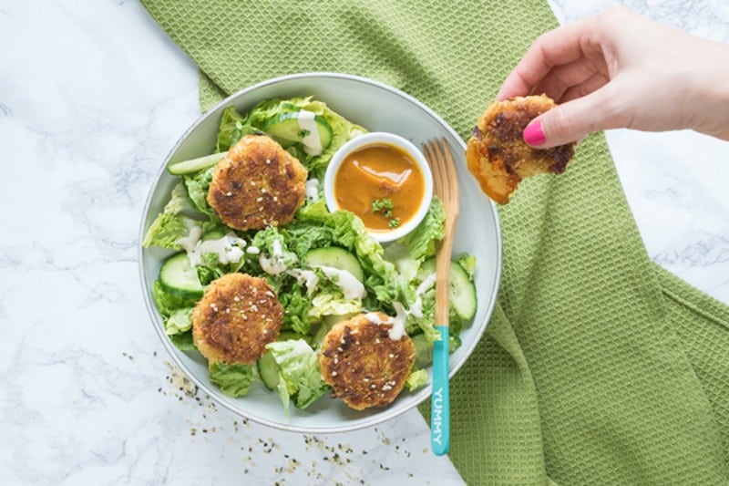 Servir trois beignets avec un peu de laitue et de ketchup de potiron, et arrosés de vinaigrette. Elle est pas belle la vie ?!?