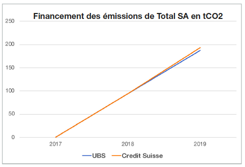 • De 2016 à 2019, les émissions de CO2 ainsi financées dans le monde entier étaient en moyenne 1,5 fois plus élevées chaque année que toutes les émissions causées à l’intérieur des frontières nationales de la Suisse. (En 2017, année de pointe, Credit Suisse a causé à elle seule deux fois plus d’émissions que l’ensemble de la population et que toutes les industries en Suisse)
