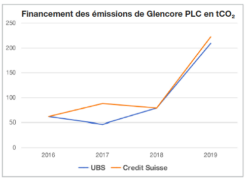 • Crédit Suisse et UBS ont, par exemple, augmenté leur financement en faveur de Glencore PLC, même si la stratégie d’expansion de la société dans le domaine du charbon ne correspond en rien à une sortie urgente et nécessaire de ce combustible extrêmement néfaste pour le climat.