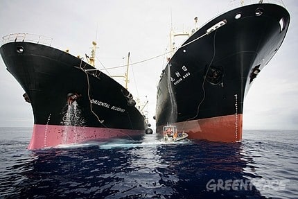 Greenpeace dénonce le ravitaillement en fioul du navire usine Nisshin Maru par le navire panaméen Oriental Bluebird, un navire non déclaré à la commission baleinière internationale, donc illégal. Greenpeace au…
