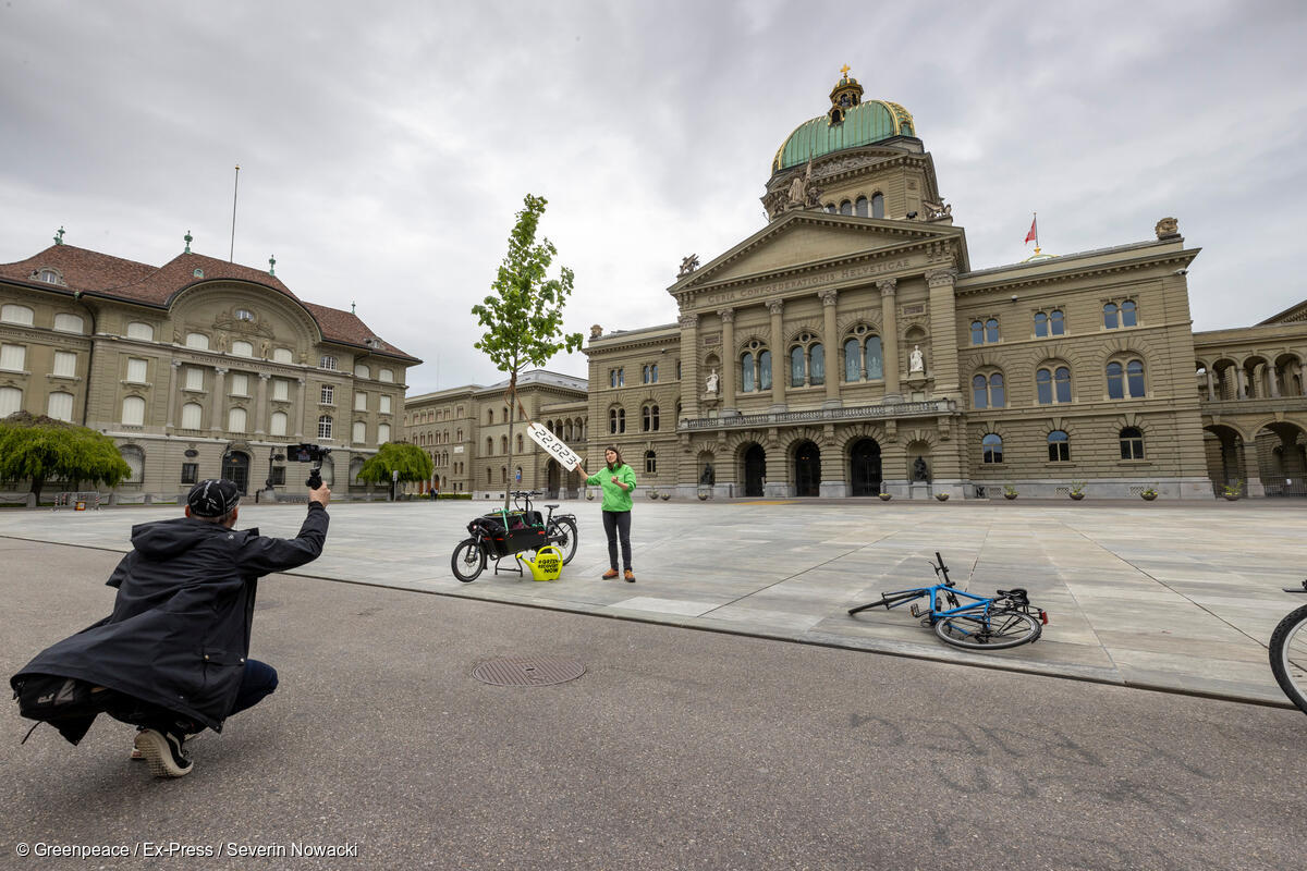 Ce matin, des militants Greenpeace ont présenté la pétition "Covid-19: le soutien apporté à l'économie doit tenir compte du climat" aux Parlementaire fédéraux.
