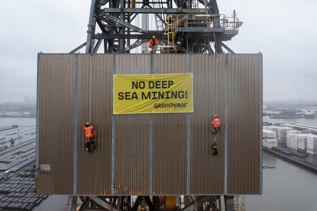 Les militants·es Greenpeace ont accroché un bannière sur un navire appartenant à Allseas, une entreprise suisse installée dans le canton de Fribourg. Ce bateau est l'objet de travaux depuis le mois de septembre afin de devenir le premier à pouvoir réaliser des opérations d'extraction minière en eaux profondes.
