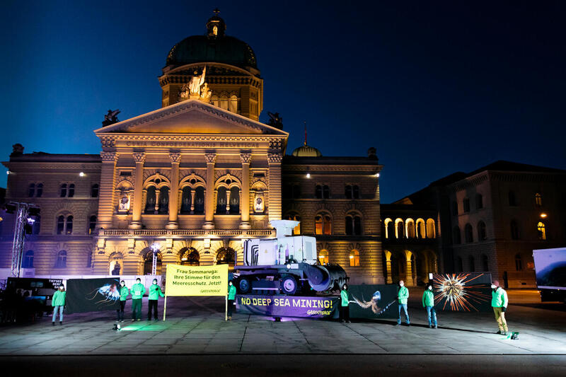 Ce matin de bonne heure, une scène inhabituelle s'est déroulée sur la Place fédérale : 14 militant·e·s Greenpeace ont apporté les grands fonds marins à Berne.